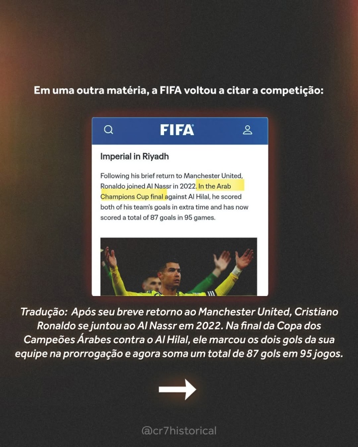 近日,C罗球迷号@cr7historical发布内容澄清:“很多人向我询问阿拉冠的相关情况——也就是2023年C罗代表利雅得胜利征战的那项赛事。