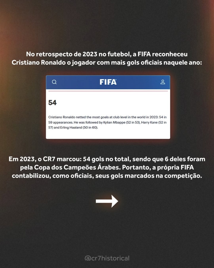 “C罗是2023年全球俱乐部层面进球最多的球员:59次出场打进54球。紧随其后的是姆巴佩(53场52球)、凯恩(57场52球)以及哈兰德(60场50球)。”
